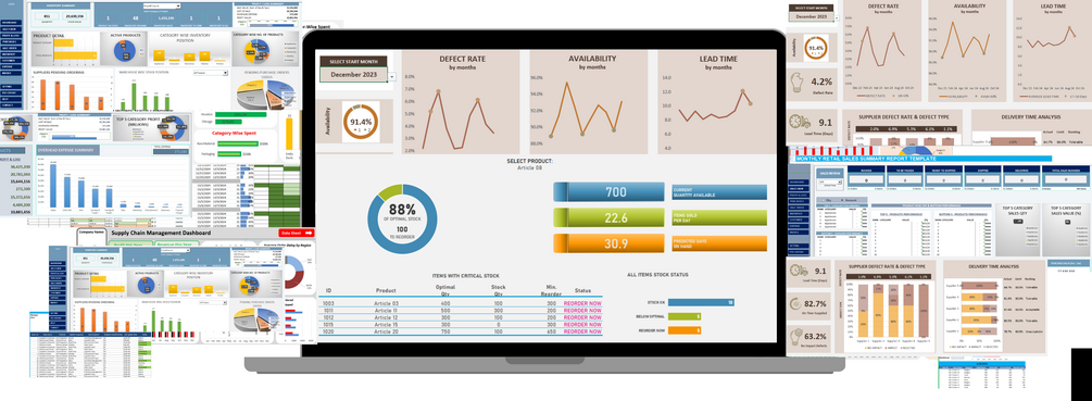 Our Supply Chain Management Dashboard empowers professionals to monitor, analyze, and optimize every stage of their operations โ from cash-to-cash cycle times to service rates โ all in one place.